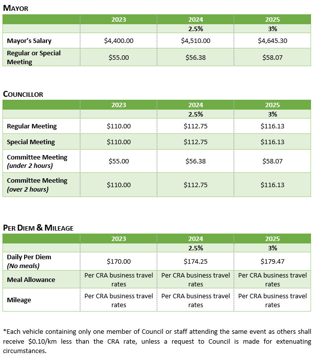 Rates of remuneration for council members are set each year. Remuneration is paid for attendance at regular meetings, special meetings, committee meetings and for time spent on Town business. The current rates of remuneration are as follows: