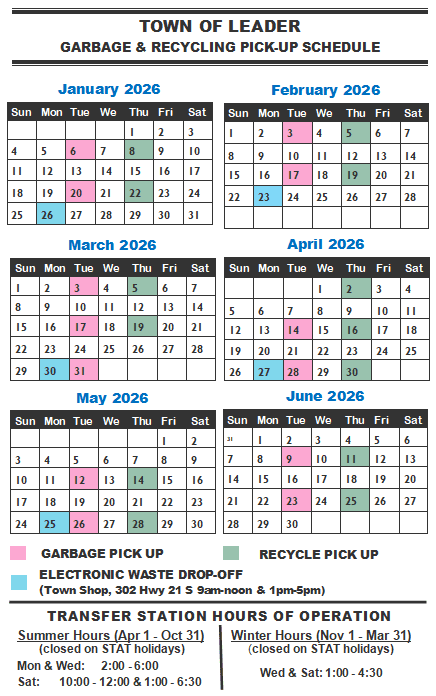 The Town of Leader Transfer Station is located approximately 2 km north of town along Range Road 3264. There are two large bins on site to collect residential waste, an oil collection facility, scrap metal collection, shingle drop off, and burn area for clean wood and yard waste.